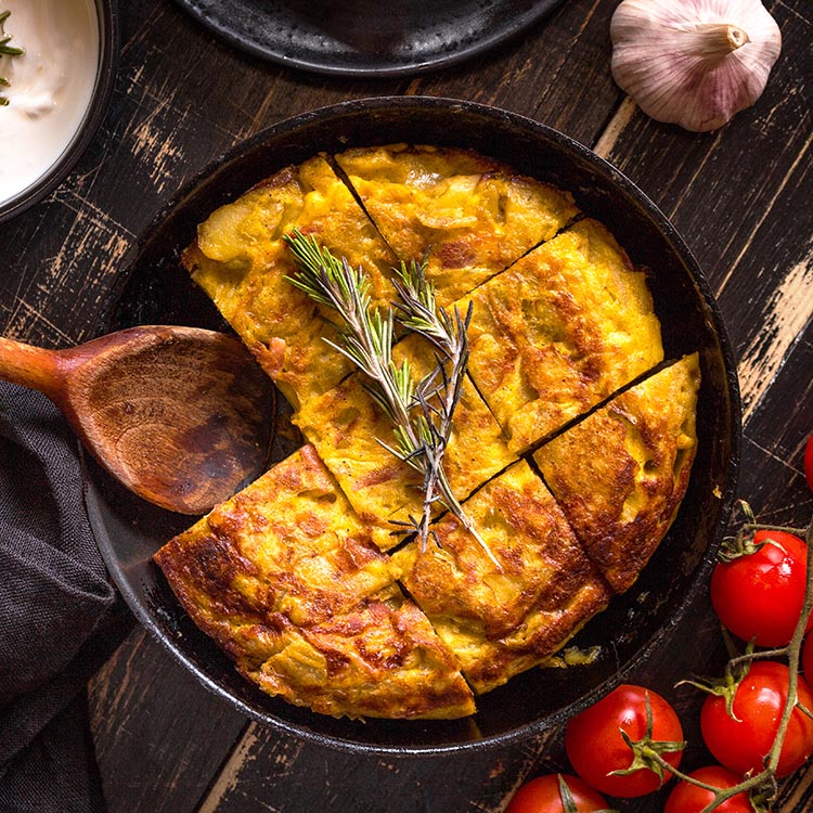 Made with eggs and potatoes and sometimes sprinkled with onion, chives, or garlic, this is typically found on the menu at almost any café in Spain.