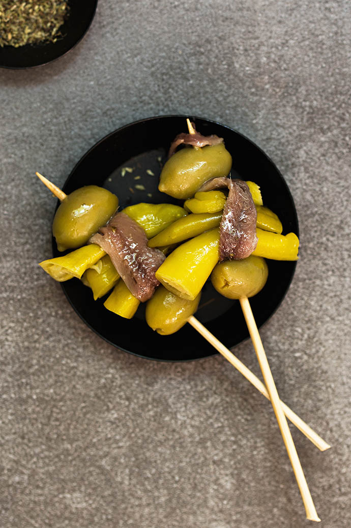 They’re salty and savory skewers made of guindilla peppers, white anchovies, and green olives, all served on a toothpick.