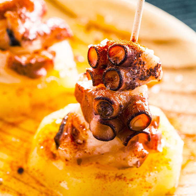 Pulpo a la Gallega is typically served on a wooden plate with sliced potatoes. The key is to find a spot that cooks the octopus perfectly (or else it ends up rubbery).