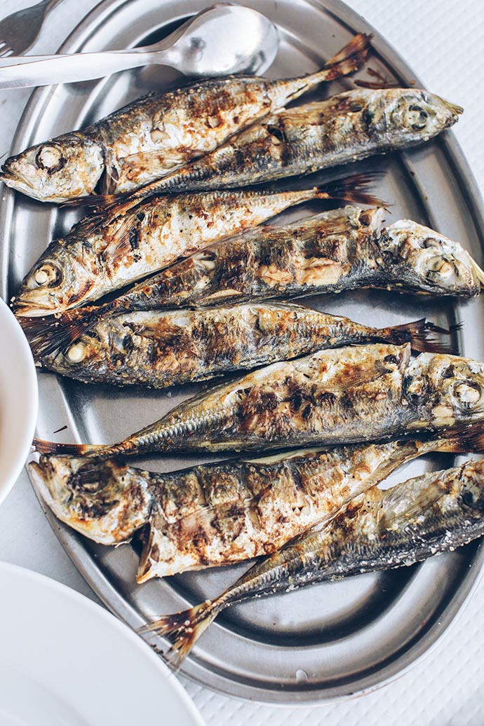 Sardinhas assadas is typical comfort food of Portugal. The platter of grilled sardines typically involves leaving the fish intact, bones and all. When eaten, you avoid the spine by biting into the side.