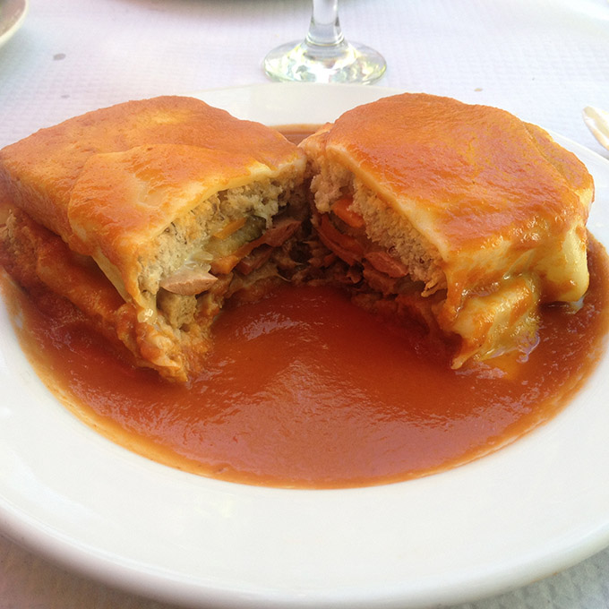 While it’s mainly found in Porto, you can often find it in cafés all throughout Portugal. Instead of being filled with ham and cheese, it’s got allllll the works: ham, linguiça sausage, steak, and cheese. And then it’s covered in a beer-tomato sauce and served with fries!
