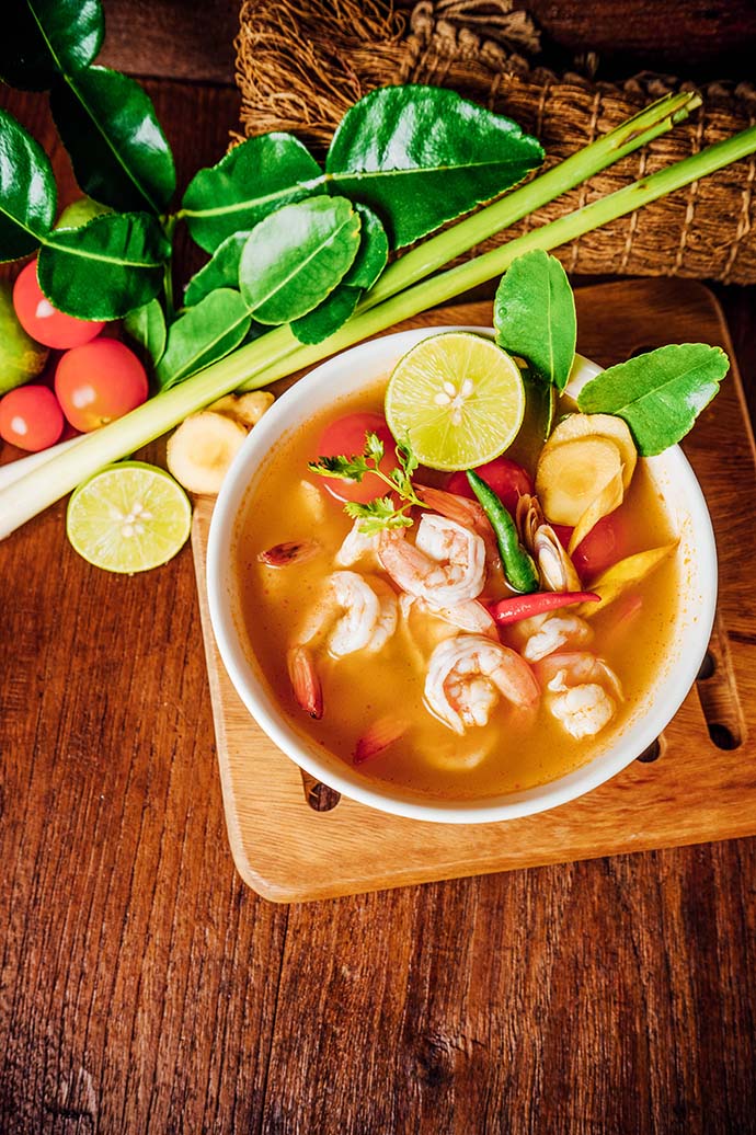 Tom Yum Goong is the most well-known variety of Tom Yum and is made with shrimp. It’s characterized by its distinct hot and sour flavors, with fragrant spices and herbs.