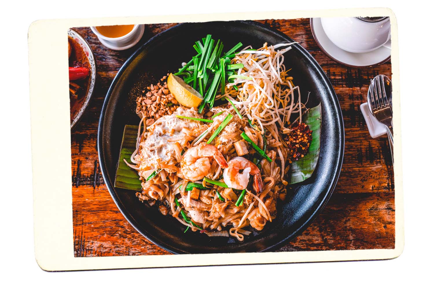 Pad Thai or Phad Thai is a stir-fried noodle dish commonly served as street food and at most restaurants in Thailand. The typical ingredients you’ll find? Rice noodles, eggs, tofu, fish sauce, shrimp, garlic, red chili pepper, and peanuts!
