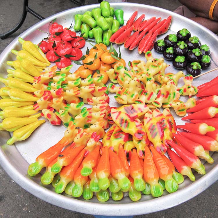 Thai marzipan is made from mung beans and is sculpted and painted to look like little glossy fruits and vegetables.