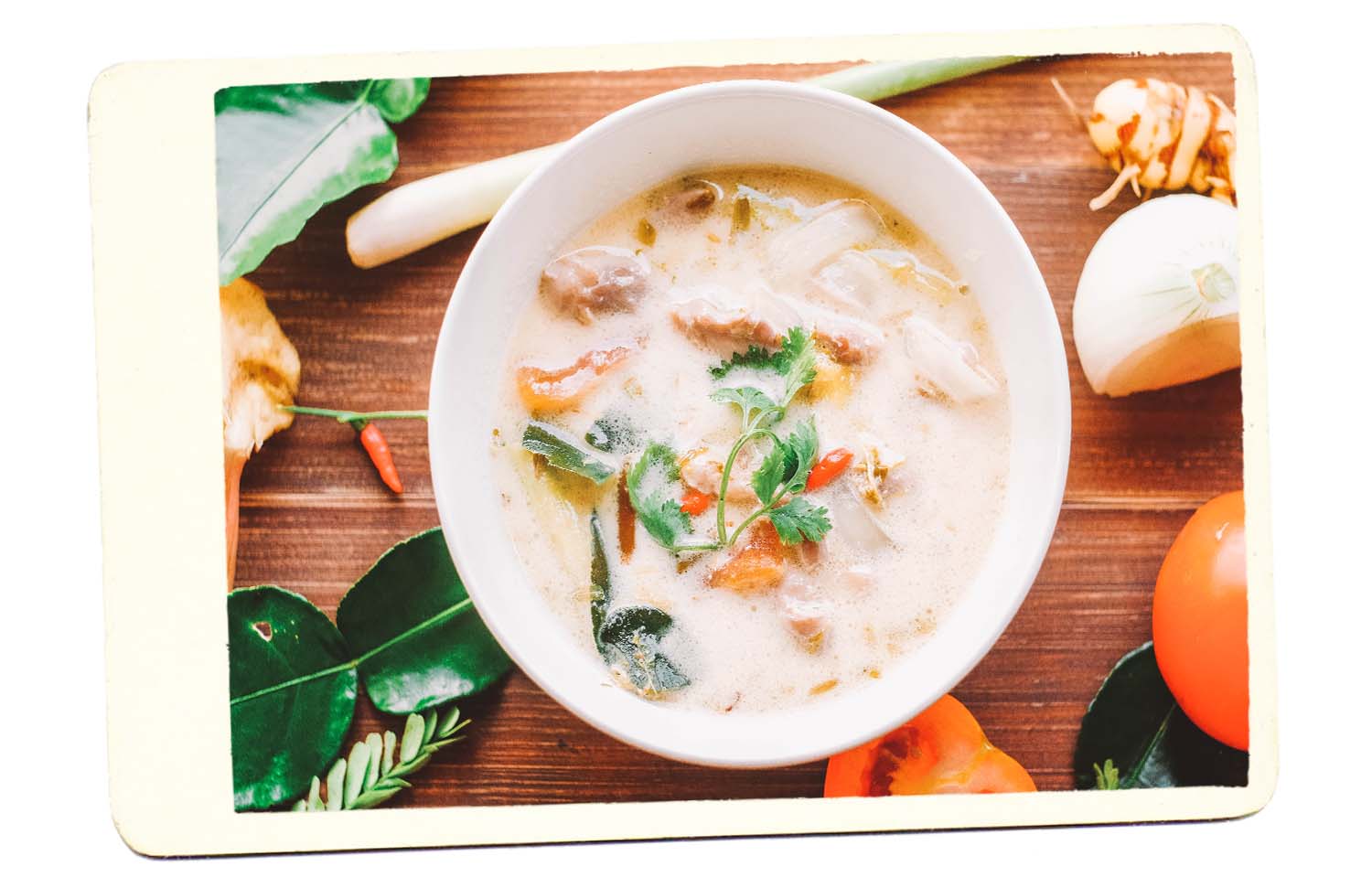 Most recipes typically include coconut milk, chicken, galangal (aka Thai ginger, but with a distinctly different flavor than the ginger you’re probably familiar with), lime, lemongrass, chili peppers, mushrooms, and fish sauce.