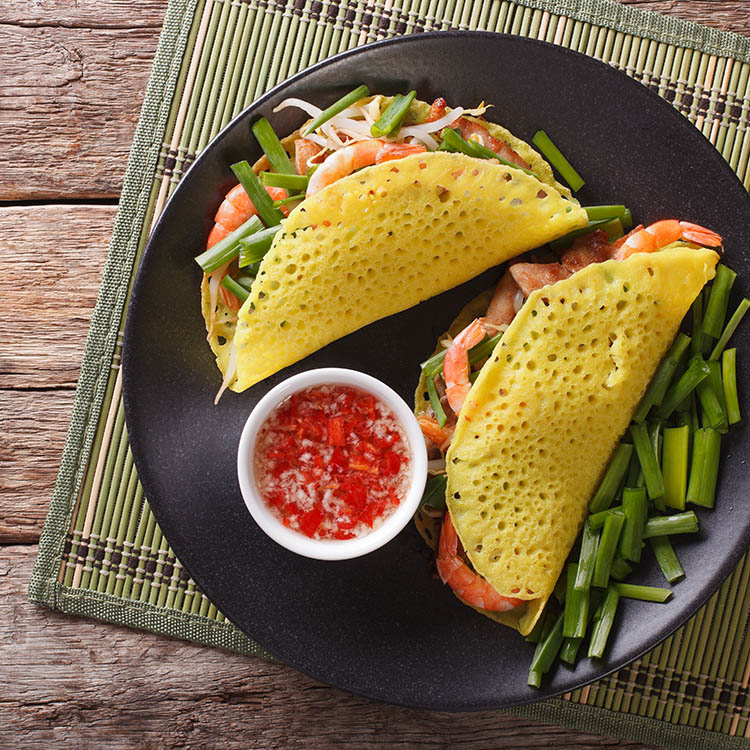 Bánh Xèo is a savory crepe made from rice flour and turmeric powder, which is then stuffed with pork, shrimp, and bean sprouts.