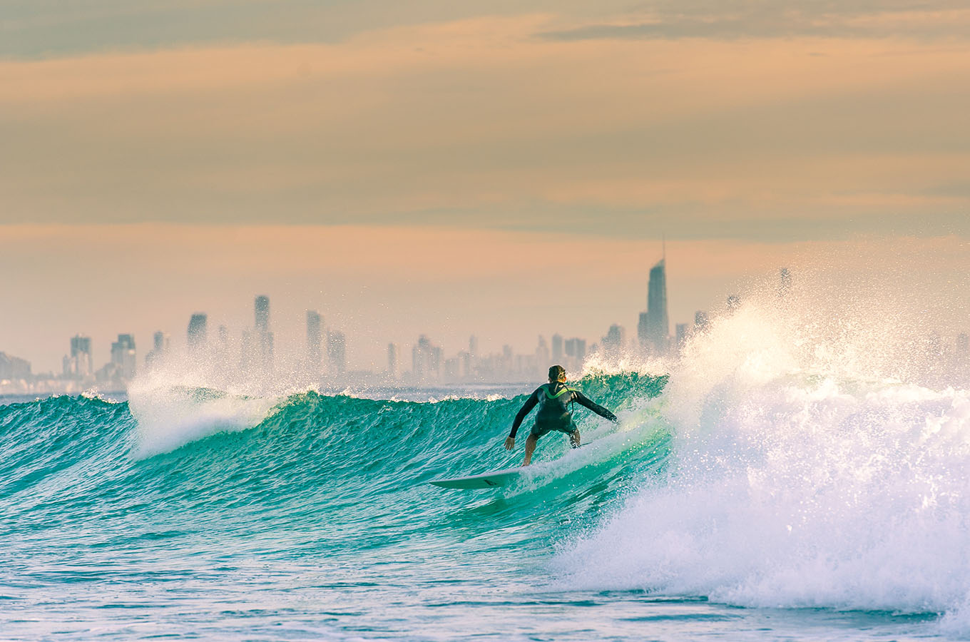 Australia’s Gold Coast is notable for its world-renowned surfing beaches with waves to challenge experienced surfers or to encourage novices.