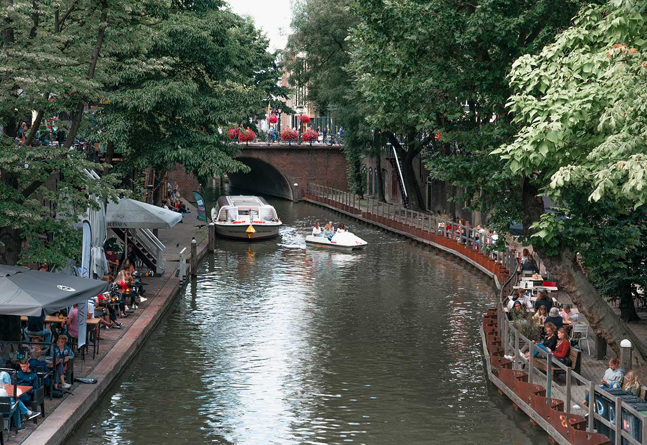 In the middle of the city stands the Dom tower, which can be seen from any point in the city, but even more iconic are the canals with their wharf cellars that house cafés and terraces by the water.