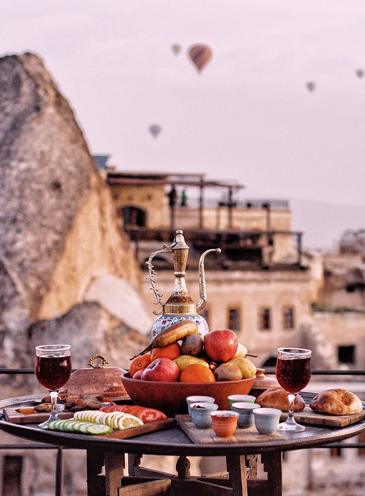 Find a spot for yourself on one of the gorgeous terraces overlooking the desert landscape. And start early! Get up before dawn and watch the sunrise then start spotting hot air balloons.