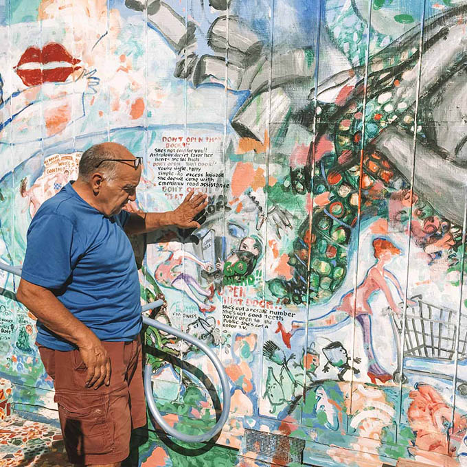 Above is Gonzalo, the husband of the artistic duo that created the mosaic kingdom. The whole wall is a painted mural, depicting the events that led up to him meeting his wife and scenes from their life. He’s so excited to share his journey and inspire others to live passionately creative lives.