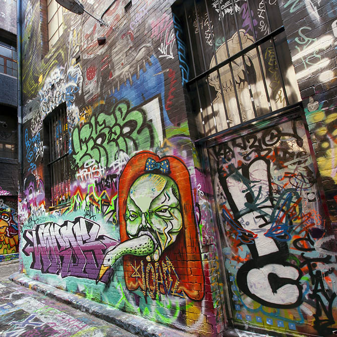 Some great street art in Melbourne can be found at Caledonian Lane, Blender Lane, Upper West Side Street, Duckboard Place, Meyers Place, Presgrave Place, and so much more.