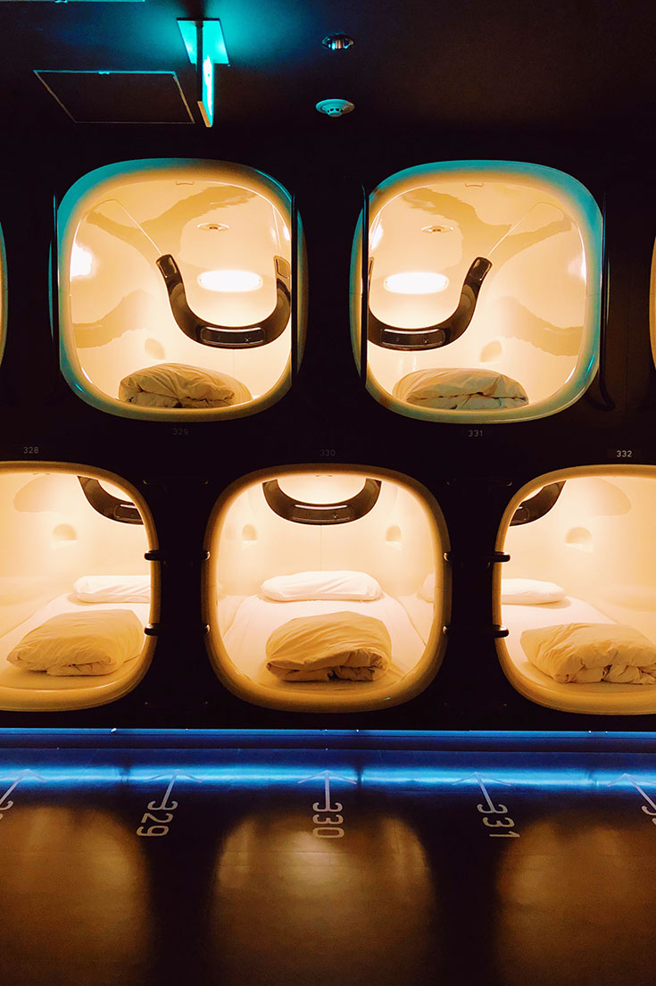 Hotels are generally a good option and, since they’re all going to be pretty tiny, pod hotels can be a fun and novel alternative.