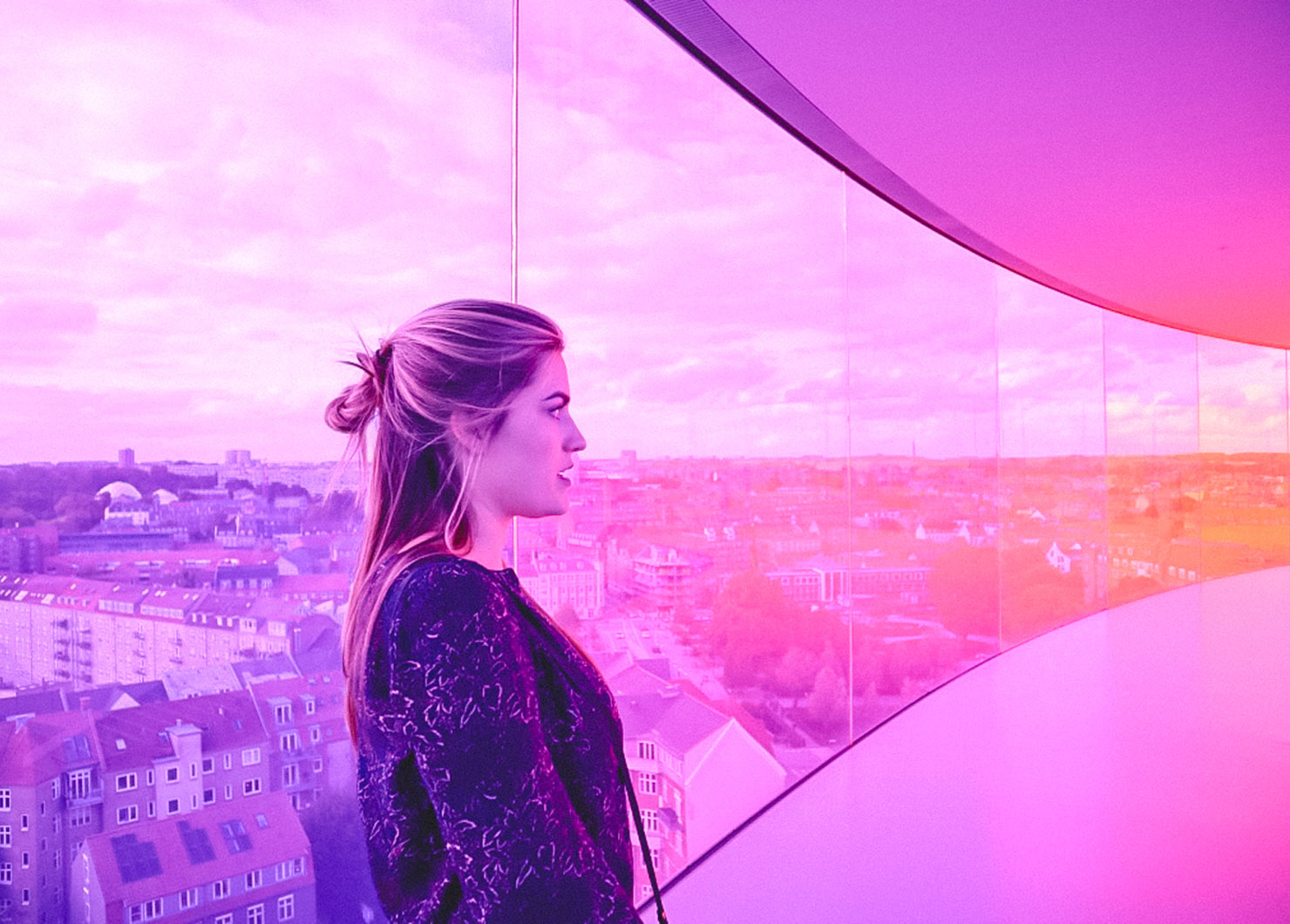 Enjoy this picturesque view from ARoS Art Museum in Aarhus. This circular walkway towers the buildings below and gives the most panoramic view of Aarhus.