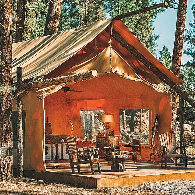 The camping at Paws Up Resort is truly luxurious, as the resort has several tent suites situated on their property. The glamping tents come with a deck, comfy chairs, and a luxurious bed.