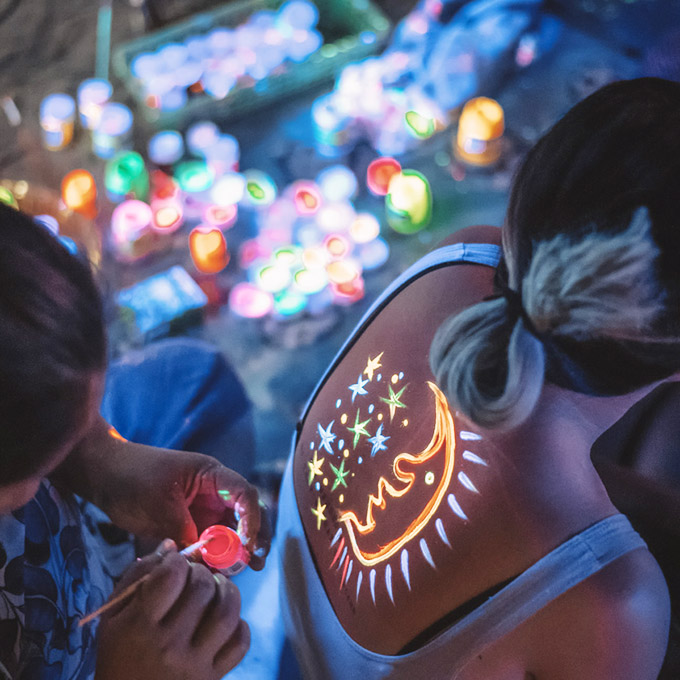 Once in Haad Rin, you can deck yourself out and begin the artistic ritual of covering yourself in neon paint. From mustaches to painted vines and all sorts of funky designs, prepare to glow!