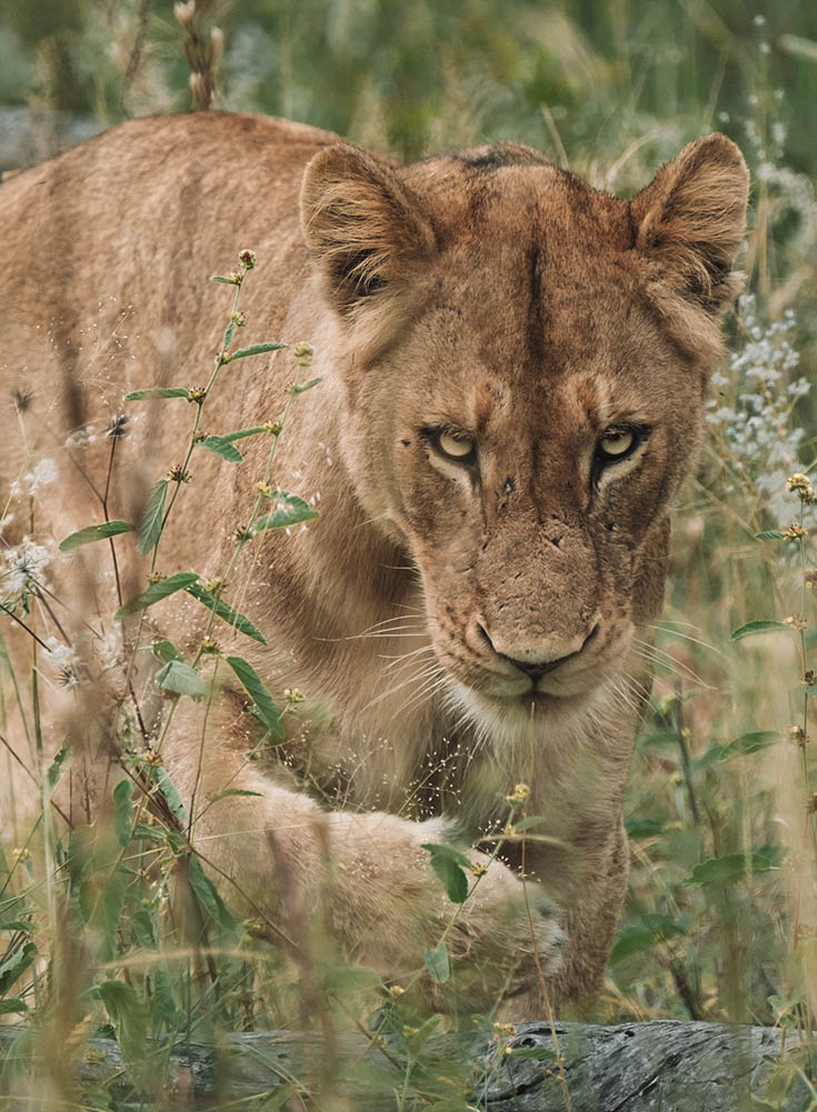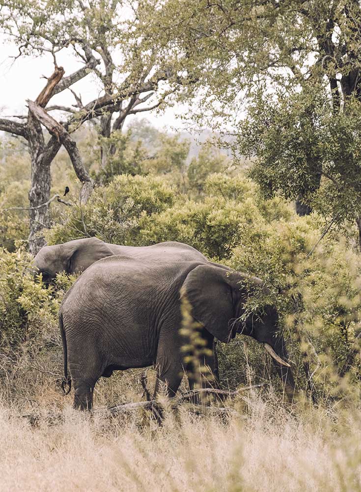 Lion photographed with a zoom lens at F/2.8; shallow depth of field. Elephants photographed from a distance at F/5.6; greater depth of field.