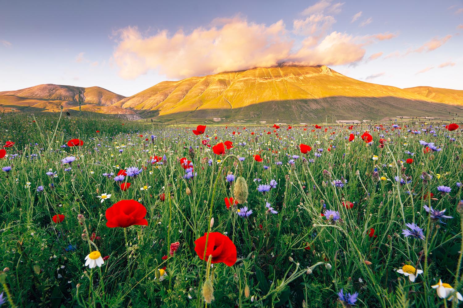Castelluccio Di Norcia is tucked away in the heart of Valnerina inside the Mounts Sibillini National Park. From May to July, the lands fill with colorful flowers, with shades ranging from yellow to red to white to violet; the time is affectionately known as the “Fiorita.”