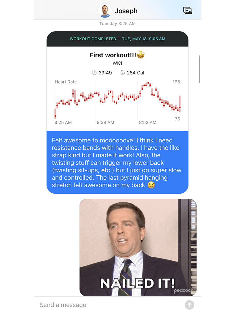 Each workout is demonstrated with a video and your coach can go in with voice notes to make any modifications or provide encouragement throughout the workout. Plus, you can have a playlist running in the background at the same time.