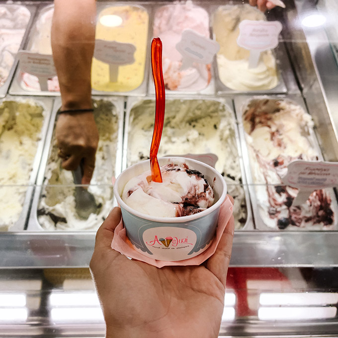 This traditional yogurt ice cream was one of my top dessert spots. While Greece seems to be in love with waffles, you can come for a cool treat here. Ask for the yogurt with sour cherries and thank me later!