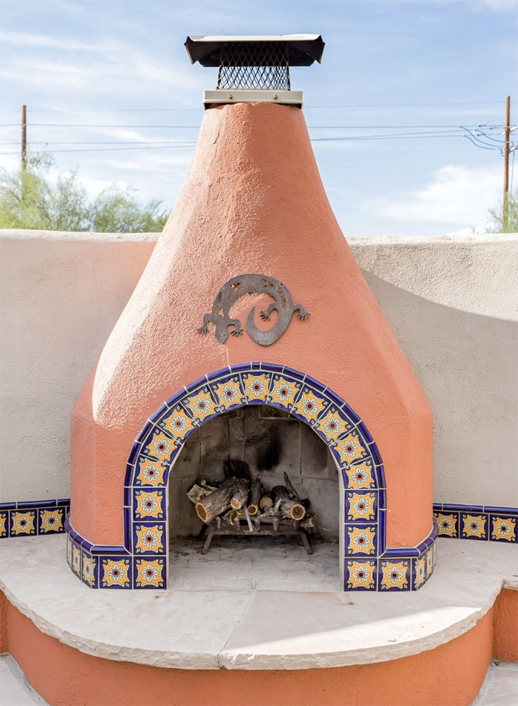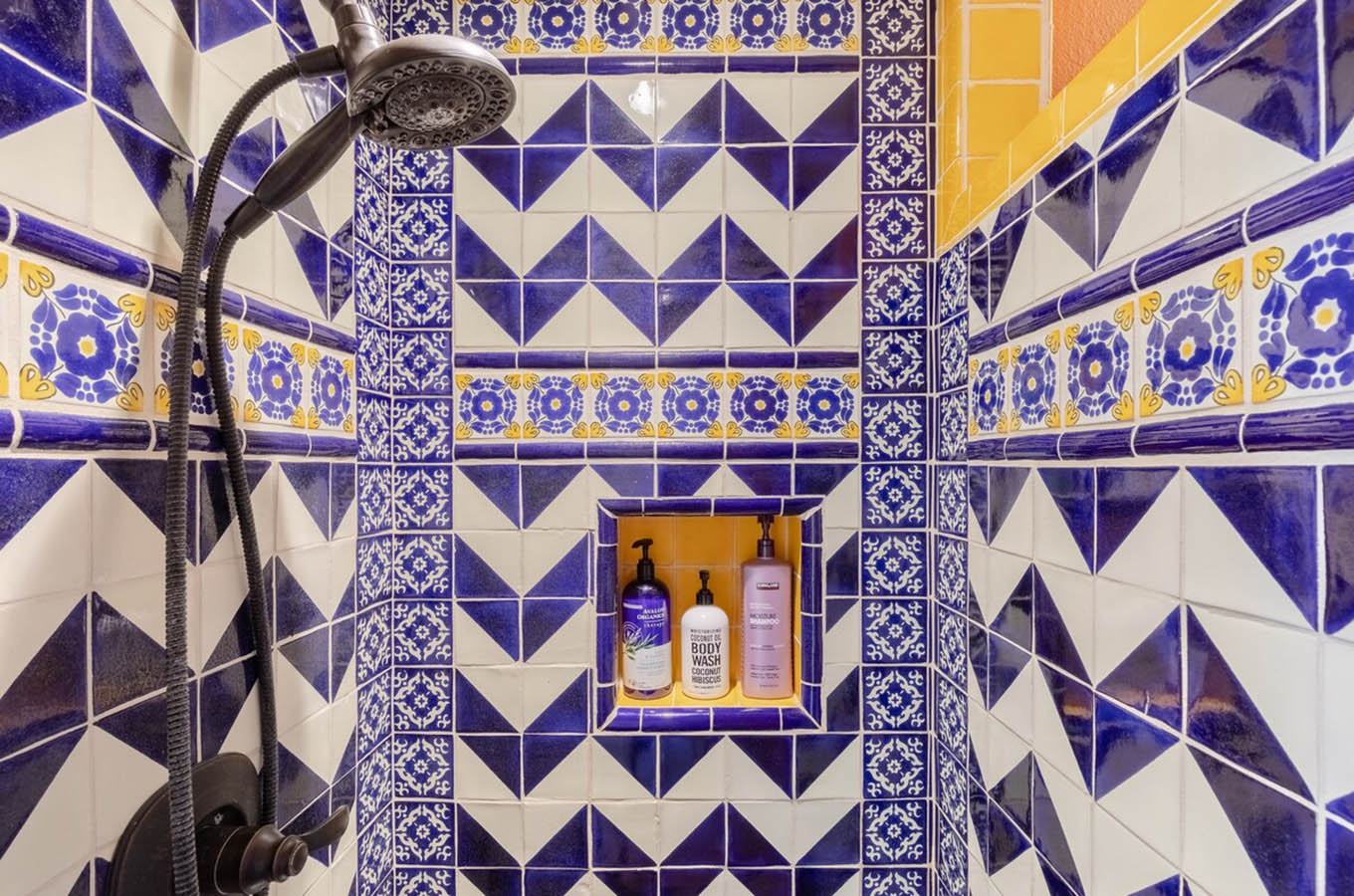 When you picture a dreamy desert home, this is likely what comes to mind: rugged stone walls, cave-like alcoves with artistic prints, and brightly patterned tiles that catch the light.