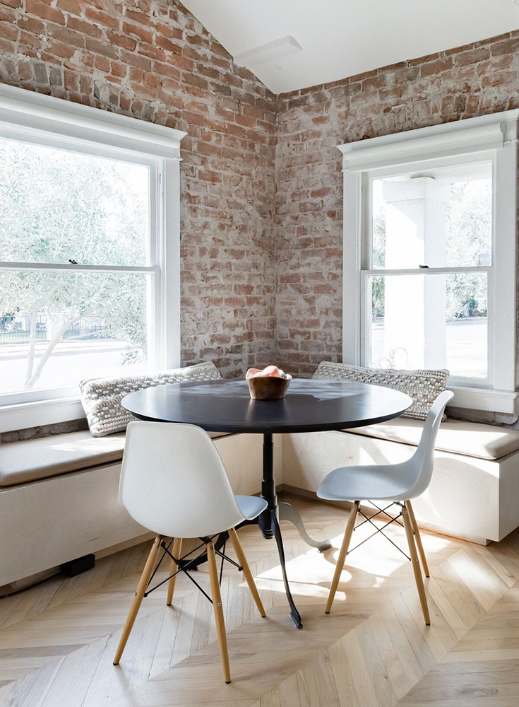 Hello, gorgeous design! From the exposed brick to the chevron hardwood floors to the modern black kitchen — there’s no shortage of beautiful vignettes and details.