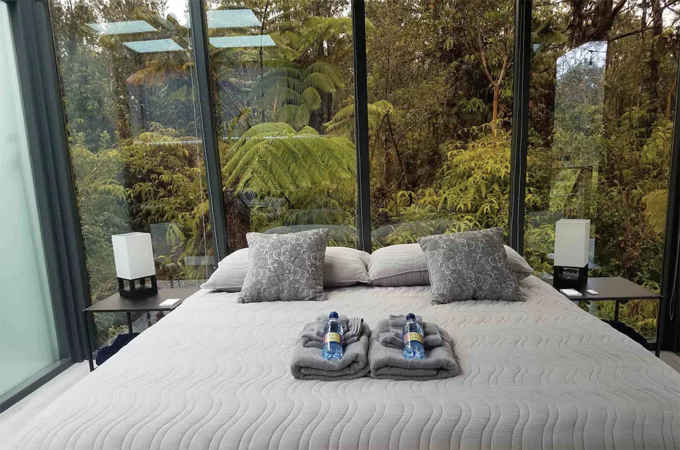 For a truly unique experience, stay at this Glass House in the heart of the Big Island. Connect with nature by immersing yourself in the tropical rain forest and listen to the rain pitter-patter on the glass ceiling.