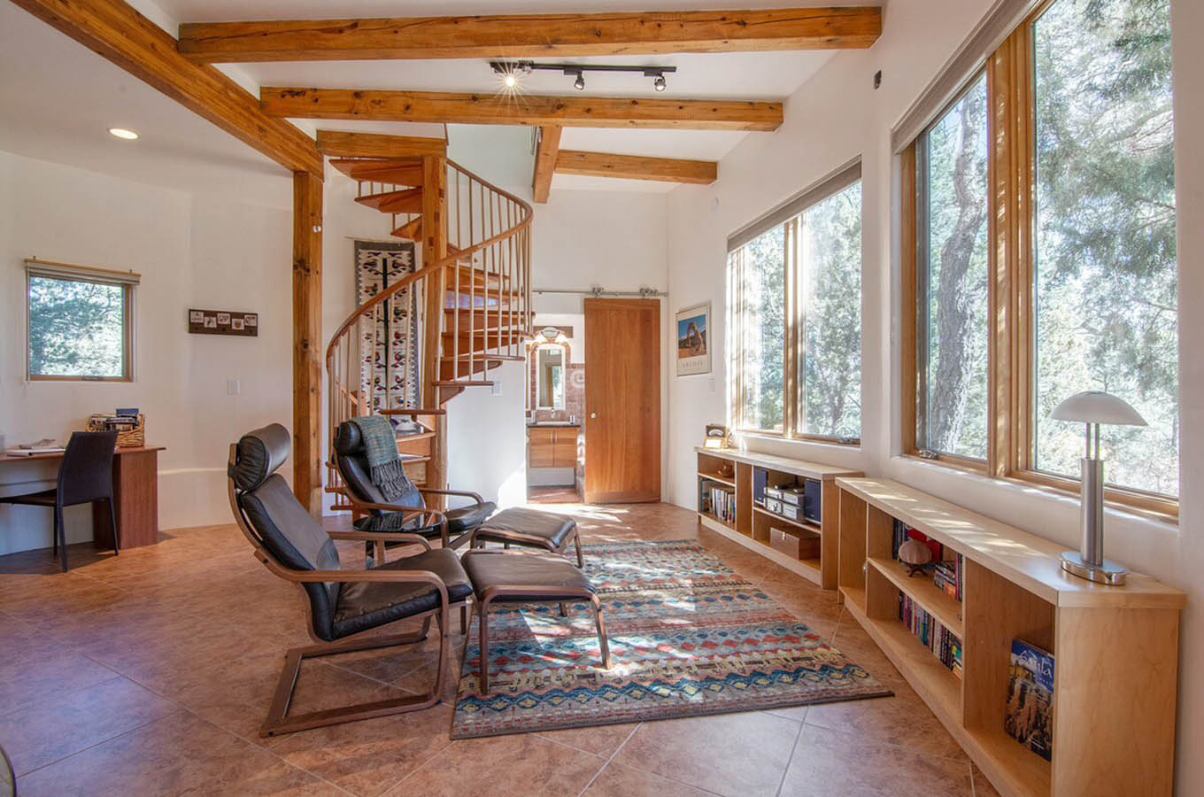 This two-story home nestled among the trees offers amazing views of the arroyo. With tons of windows, the adobe home is flooded with gorgeous light. In the summer, open up the windows and the terrace doors to let a breeze in. During the winter, ceramic thermal heaters make the place warm and cozy.