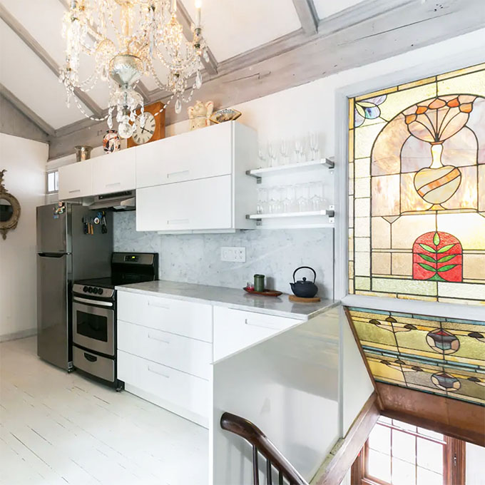 The moment you step into this home in Manhattan, you’ll feel like you’re stepping into a bohemian wonderland. Relax in one of the many nooks or take a long bath in the clawfoot tub.