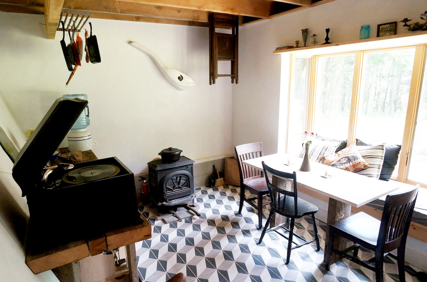 Located on 20 acres of land with private trails and mountain views, this bespoke cabin feels blissfully far away from everything, yet is still close to popular Catskill towns. There’s no electricity or running water, but there is a hand-crank Victrola!