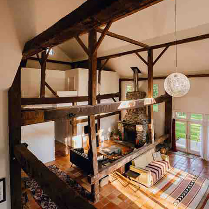 Elm Barn is where you will find a quiet retreat from the city. This lofty rebuilt barn has amazing light and is situated near a serene, semi-private lake (shared only with one neighbor) just down the road.