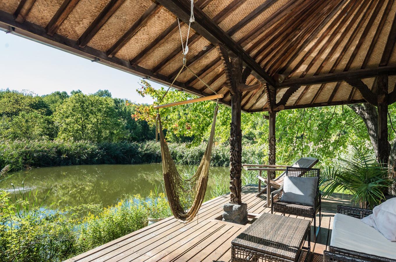 Enveloped by 7.5 acres of woodland, private pond, and grassy pasture, the Bali House will lull you into its haven and transport you to…Bali!