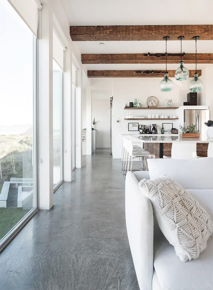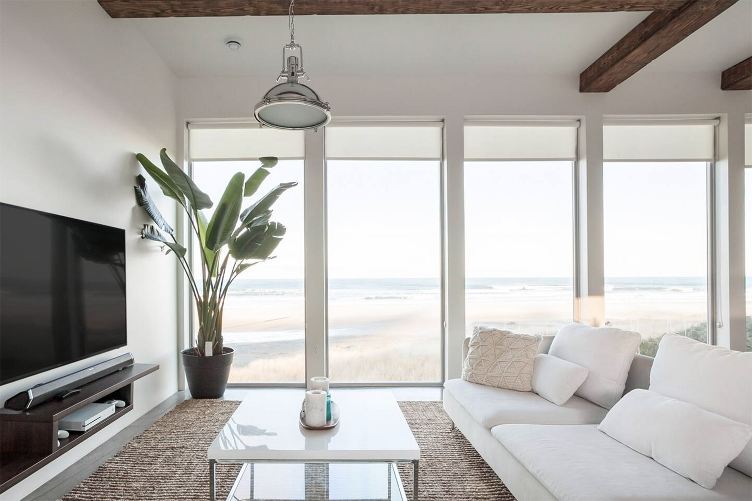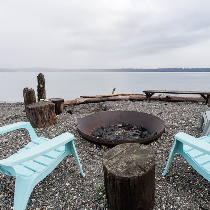 Here, you can relax around the fire pit with a glass of wine. Or, if the rain sets in, you can cozy up with a book next to the floor-to-wall windows. But, best of all—the beach is just steps away!