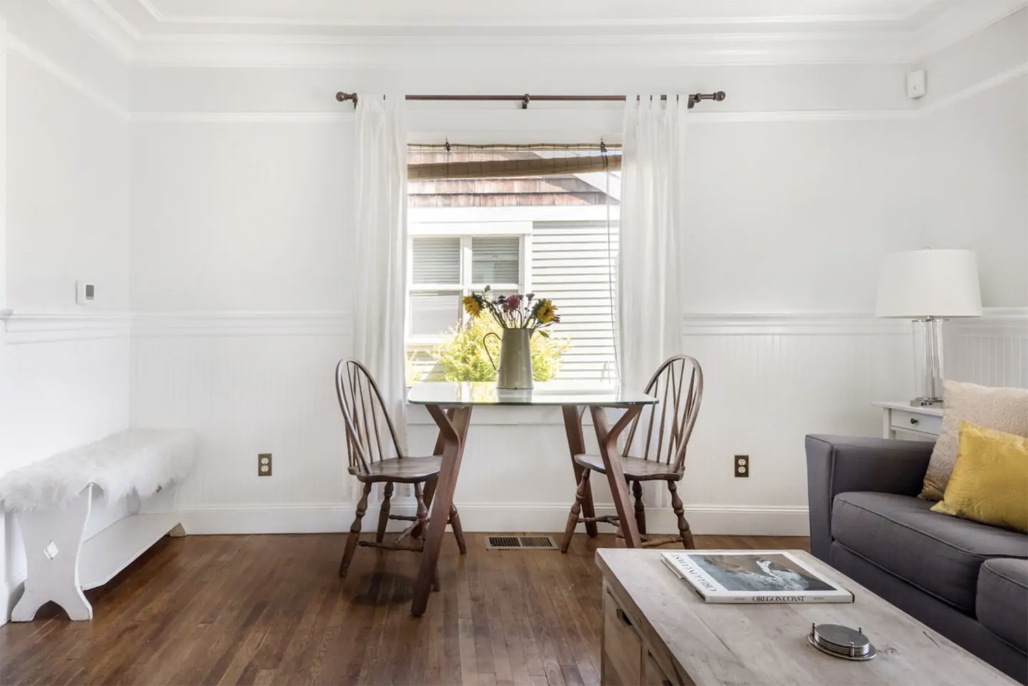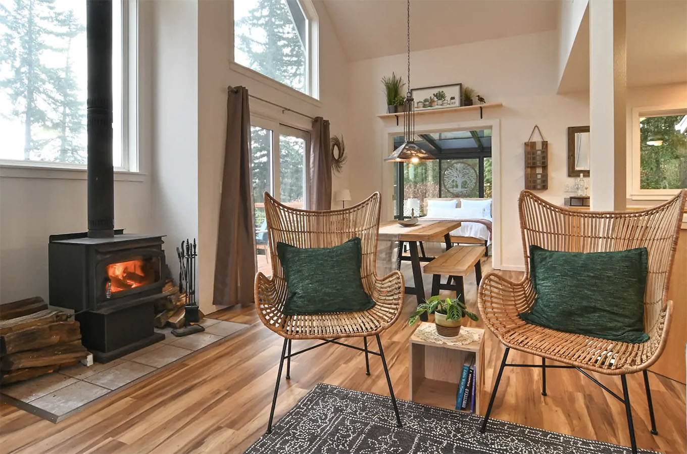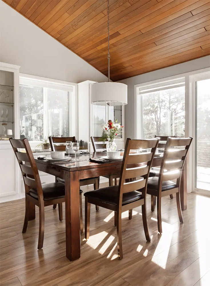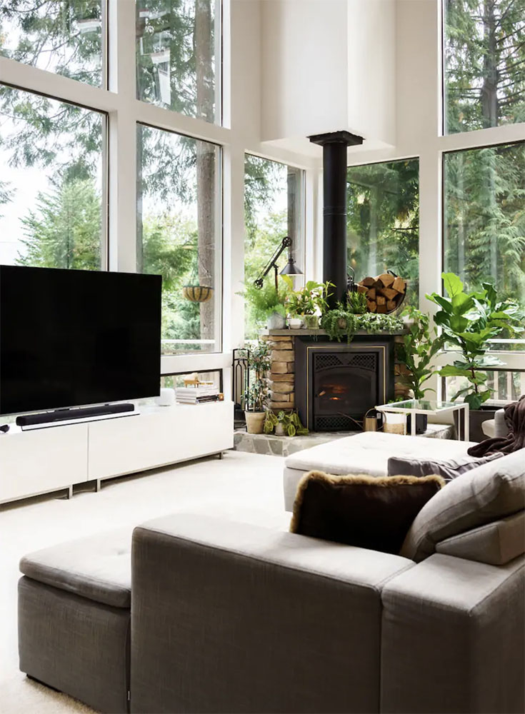 If you’re looking for a tranquil getaway in Manzanita, OR with a large group — this place can accommodate up to 10 guests! I particularly like the cozy wood-burning stove and the neutral gray aesthetic.