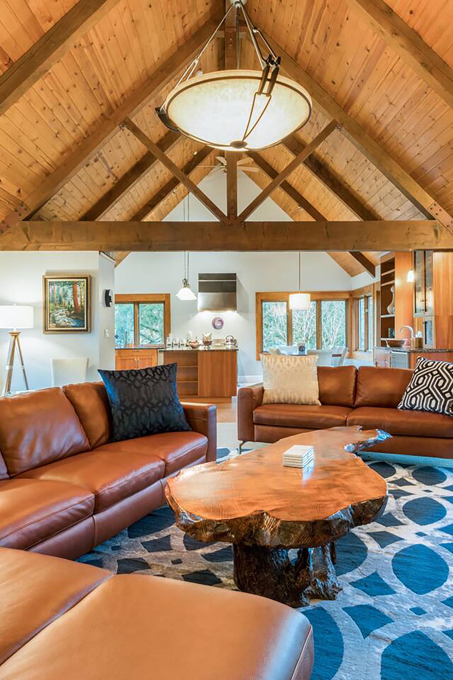 If you’re looking for the ultimate cabin experience, this home has stunning vaulted wooden ceilings, and an expansive covered outdoor patio to hang out on. And is located right above a river.