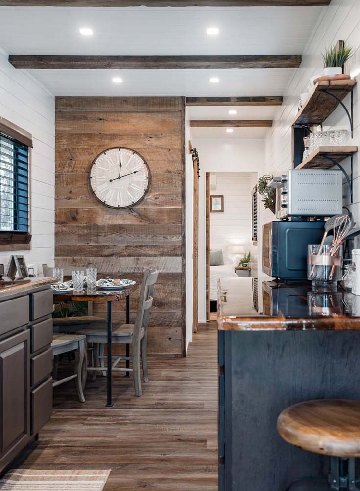 The upstairs suite features a rooftop deck, perfect for an evening cocktail. Fixer Upper fans will be glad to see all the pine shiplap and barn wood throughout!