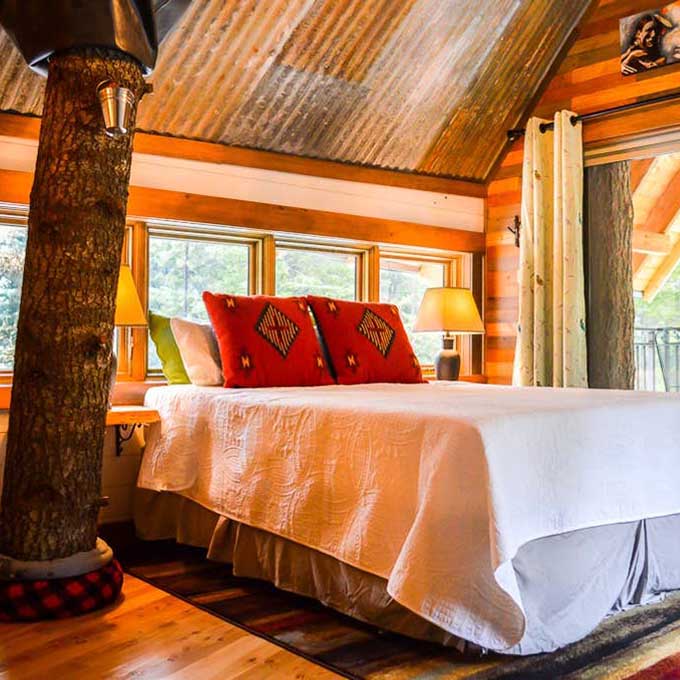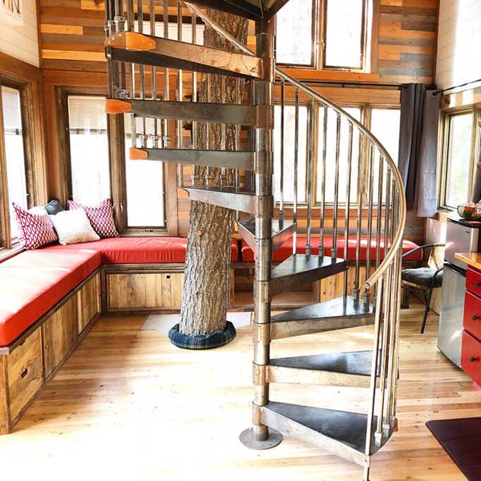 There’s no roughing it when it comes to this double-decker luxury spot. You’re greeted by a spiral staircase crafted from Douglas Fir wood and 2 outside deck areas. You’ll even find 2 living trees growing through the home’s interior!