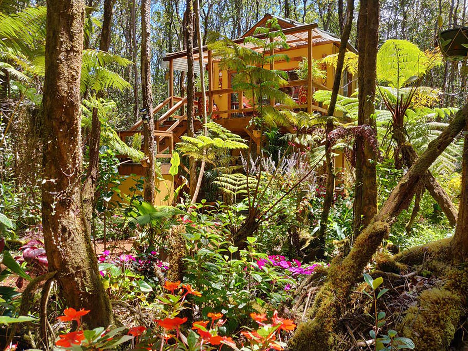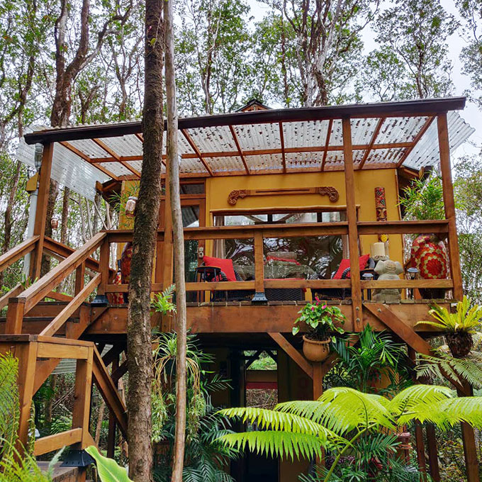 Well, the Peaceful Rainforest Treehouse Retreat, located on the big island of Hawaii, is only 8-miles away from Volcanoes National Park! Adventure through the park during the day and retreat to the rainforest at night.