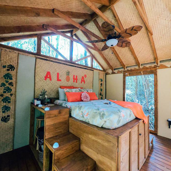 The “mind” room is the perfect place to cozy up with a good book. The “body” room has a bed with wheels—so you can roll it outside and sleep overlooking the stream below. And want to surround yourself with pine trees? Hang out in the “spirit” room, otherwise known as the hammock deck.