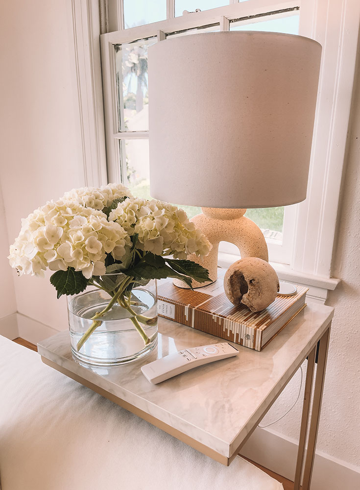 I like to keep a short vase of fresh hydrangeas next to the couch year-round. You can buy a 3-stem pack from Trader Joe’s for $4.99, and they usually last about 10 days!