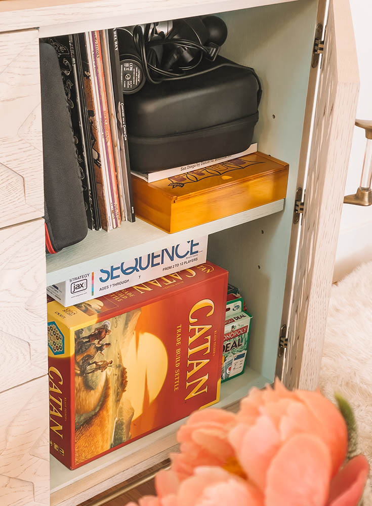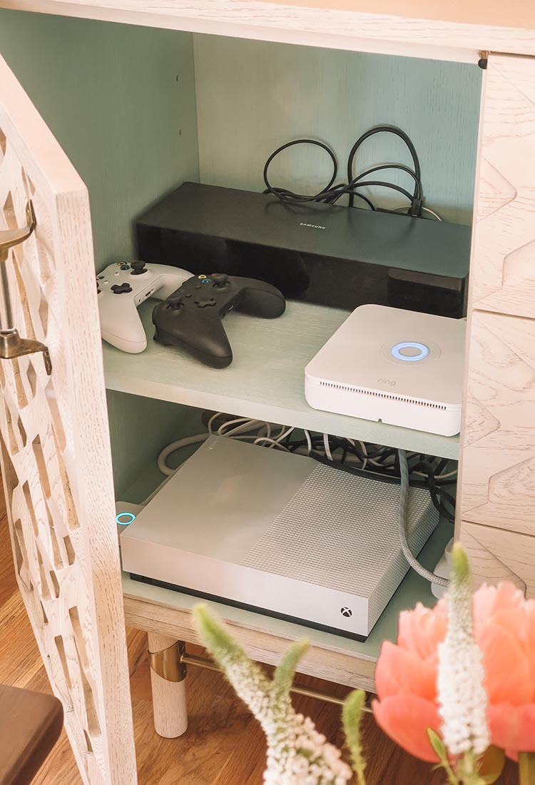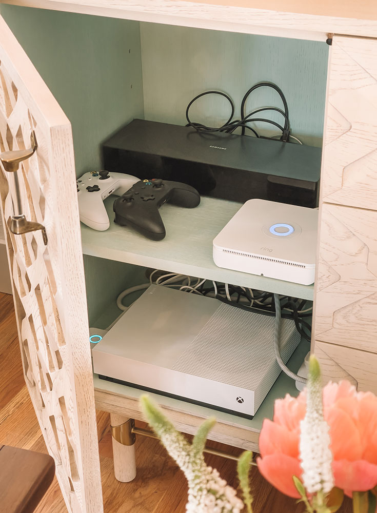 This console was one of the first things I purchased for our home. I love that it’s a neutral color, but the doors have a beautifully intricate carving so you have lots of interest and a little pop of the mint inside.