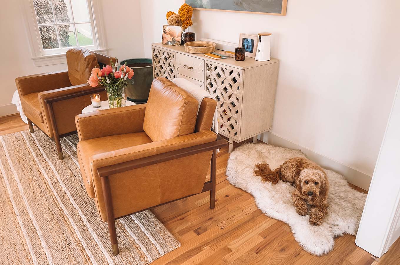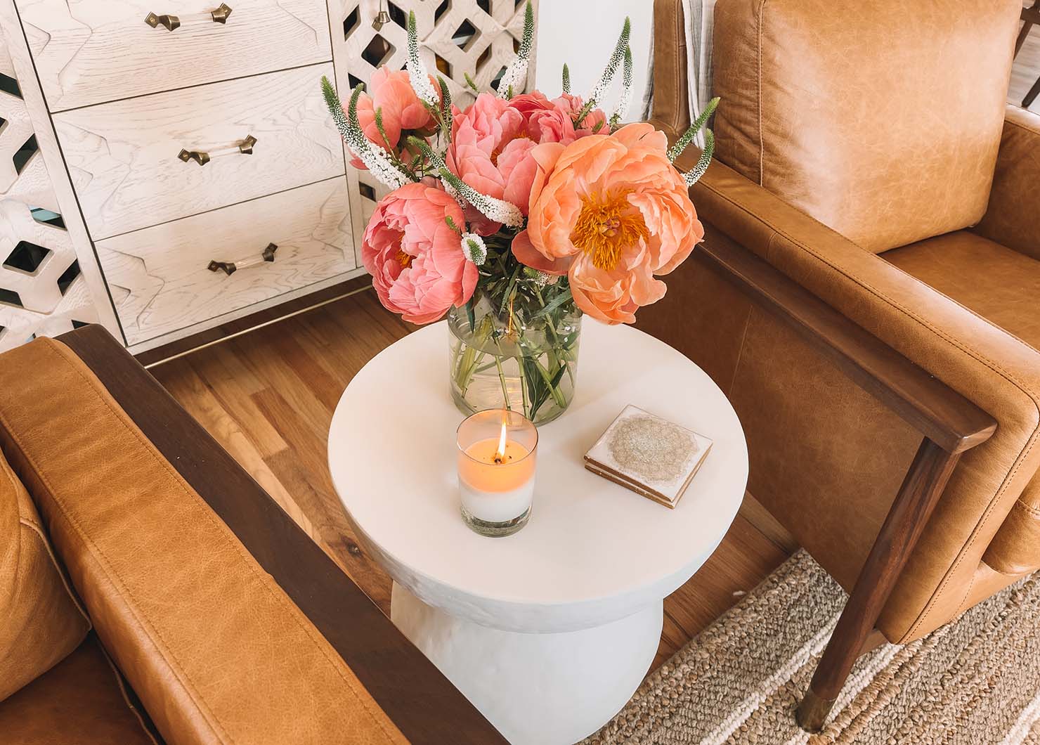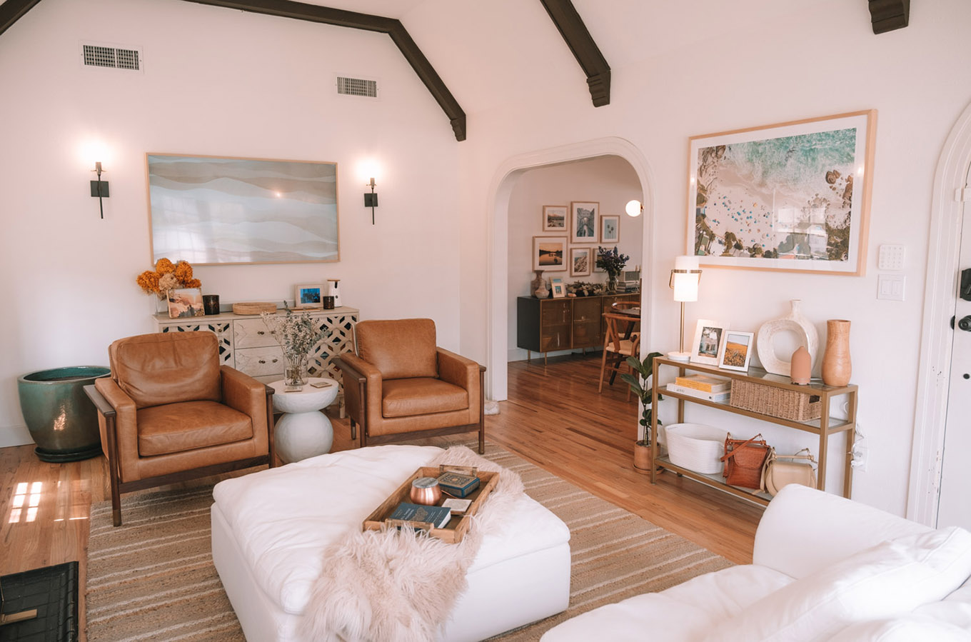 Bright white walls and warm decor make a space feel so warm, cozy, and inviting. While working with limited colors and trying to stick to warm tones, we brought in lots of texture, mixed materials, and brought in color very specifically — focusing on those “pops” of color to be through art and fresh florals.