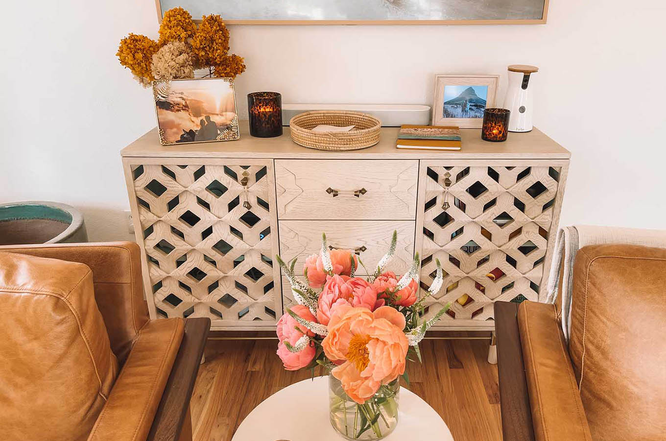 I absolutely love having fresh florals in the house. You’ll see the dried hydrangeas on the media console — and those tend to move around the room. They’re wonderful as they last forever. But, I also like to bring in fresh florals for a pop of color!