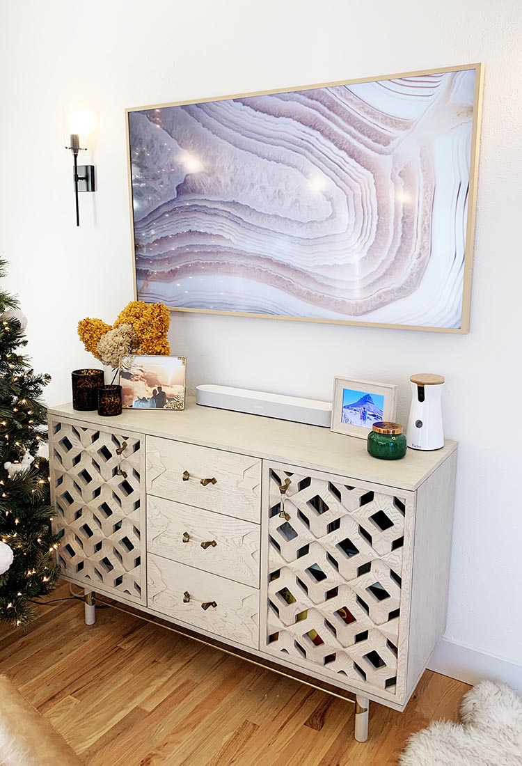 I am obsessed with our 65″ Samsung Frame TV! I loved it when we got it and I still love it a year later. What’s special about the Frame is that you it is a TV that literally has a frame (like a piece of art) and it sleeps in an art mode so it doesn’t look like a TV.