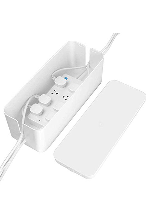 I like to feed an extension cord with multiple plug-ins into the unit, rather than running all of my cords out of the unit, and that way you don’t see any cords. We also use these cable organizer boxes to hide extension cord multi-plugs.
