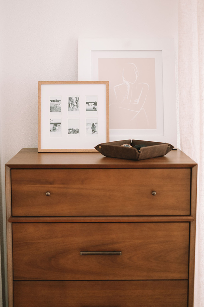 For the polaroid collage picture frame, I printed out several snaps from past trips in black and white to make it more cohesive and have a lighter and airier feeling.