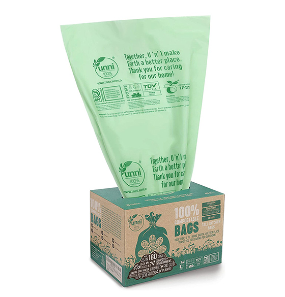 These trash bags are biodegradable, made from plant materials, and are certified compostable in the US & Europe. There are a variety of sizes, too!