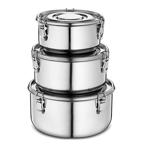 Stainless steel can keep cold foods cold and warm food warm for longer. Plus, these containers nest for compact storage and are dishwasher safe.
