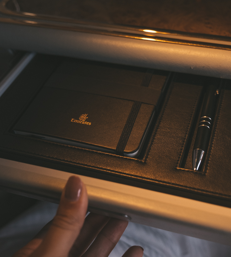 The Dubai to LA leg has free WiFi for the duration of the flight and each suite has a universal plug point and USB port for charging devices, so you can get all the work done your heart desires! One of my favorite little touches was the notepad and pen station so you can doodle or journal!