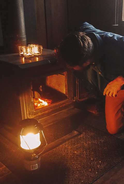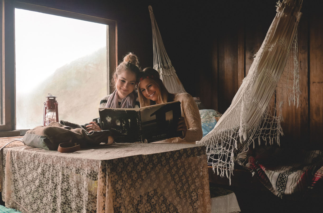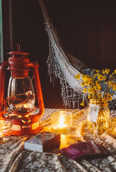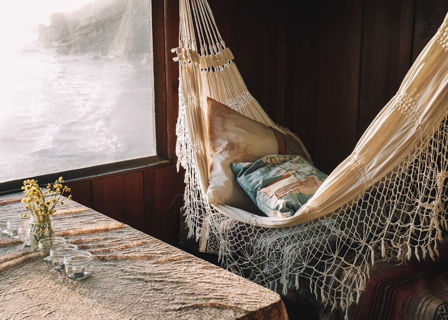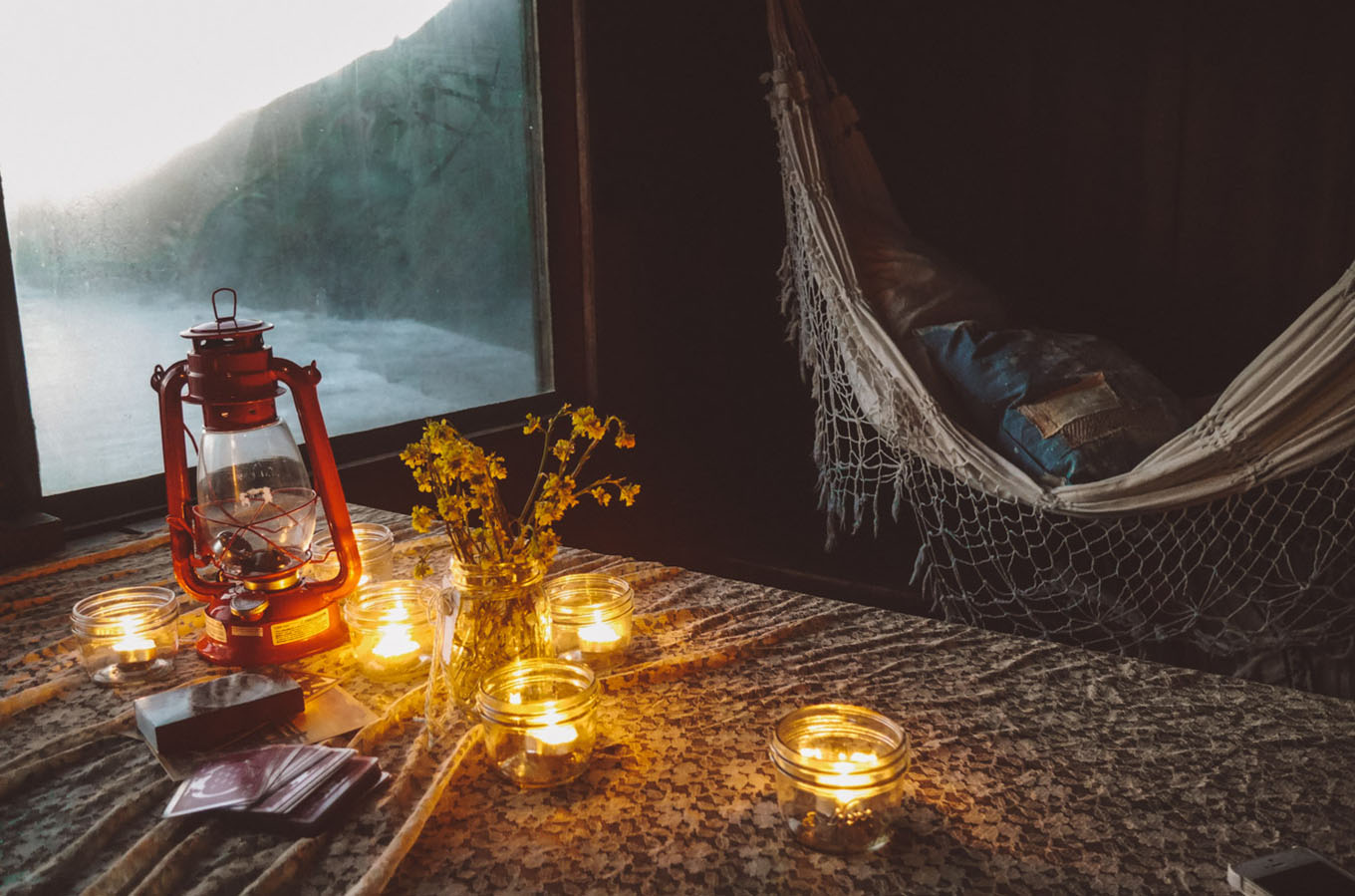 We got to work cozying things up—hanging a hammock with overstuffed pillows, lining the table in lace, and hooking candlelit lanterns from the beams. In no time at all, the cabin felt like home.