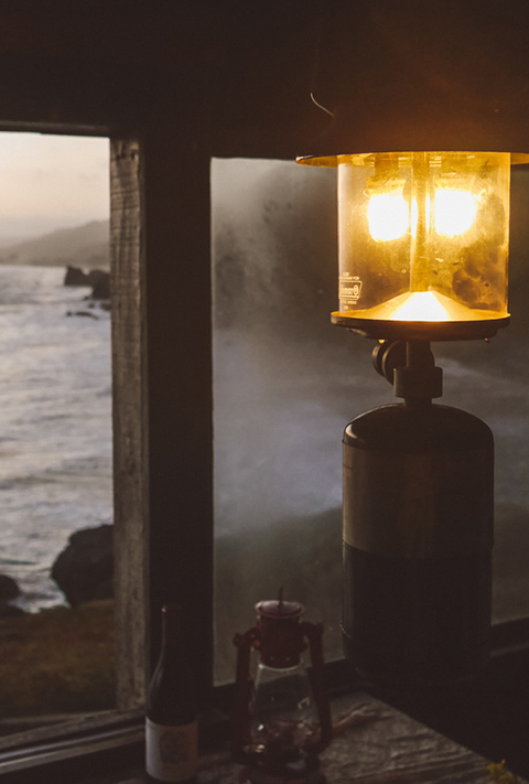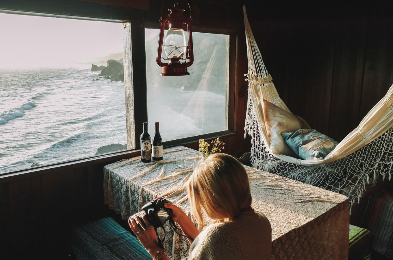 As you open the door, you’ll be greeted with a magnificent view of the ocean. While the location and cabin are absolutely stunning—come prepared. Inside there isn’t much more than a cute little fireplace in the corner. But isn’t that part of the magic?